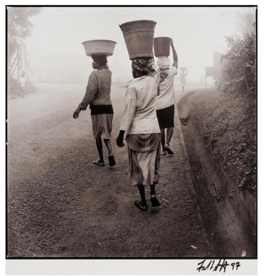 In Mamfe, when the sun comes up, the workday begins; when the sun goes down, it ends. To fulfill family needs, strong women walk on this main mountain road at both ends of the day, carrying water home from the town well.